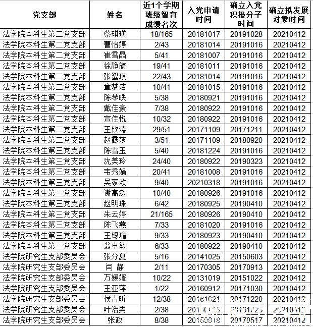 根据《温州大学学生党员发展具体标准(2020年修订)》,经过量化考核、民主测评、党的理论知识考试、答辩考核、支部讨论等,推荐为发展对象提交学院党委备案后,拟确定蔡琪瑛等28位同志为发展对象。特予公示7天(自2021年4月13日起至4月19日止),如对蔡琪瑛等同志确定为拟发展对象有不同意见或反映有关问题者,在公示期内可来电、来信、来访的形式反映问题,以个人名义反映问题的提倡真实署名,联系支部书记或学院学工办2-117办公室林老师,电话:0577-86680918,邮箱:fzxyxsk@126.com。
