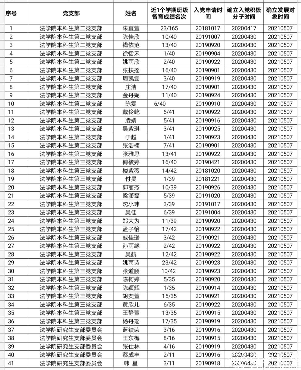 根据《温州大学学生党员发展具体标准(2020年修订)》,经过量化考核、民主测评、党的理论知识考试、答辩考核、支部讨论等,推荐为发展对象提交学院党委备案后,拟确定朱夏萱等41位同志为发展对象。特予公示7天(自2021年5月7日起至5月13日止),如对朱夏萱等同志确定为拟发展对象有不同意见或反映有关问题者,在公示期内可来电、来信、来访的形式反映问题,以个人名义反映问题的提倡真实署名,联系支部书记或学院学工办2-117办公室林老师,电话:0577-86680918,邮箱:fzxyxsk@126.com。