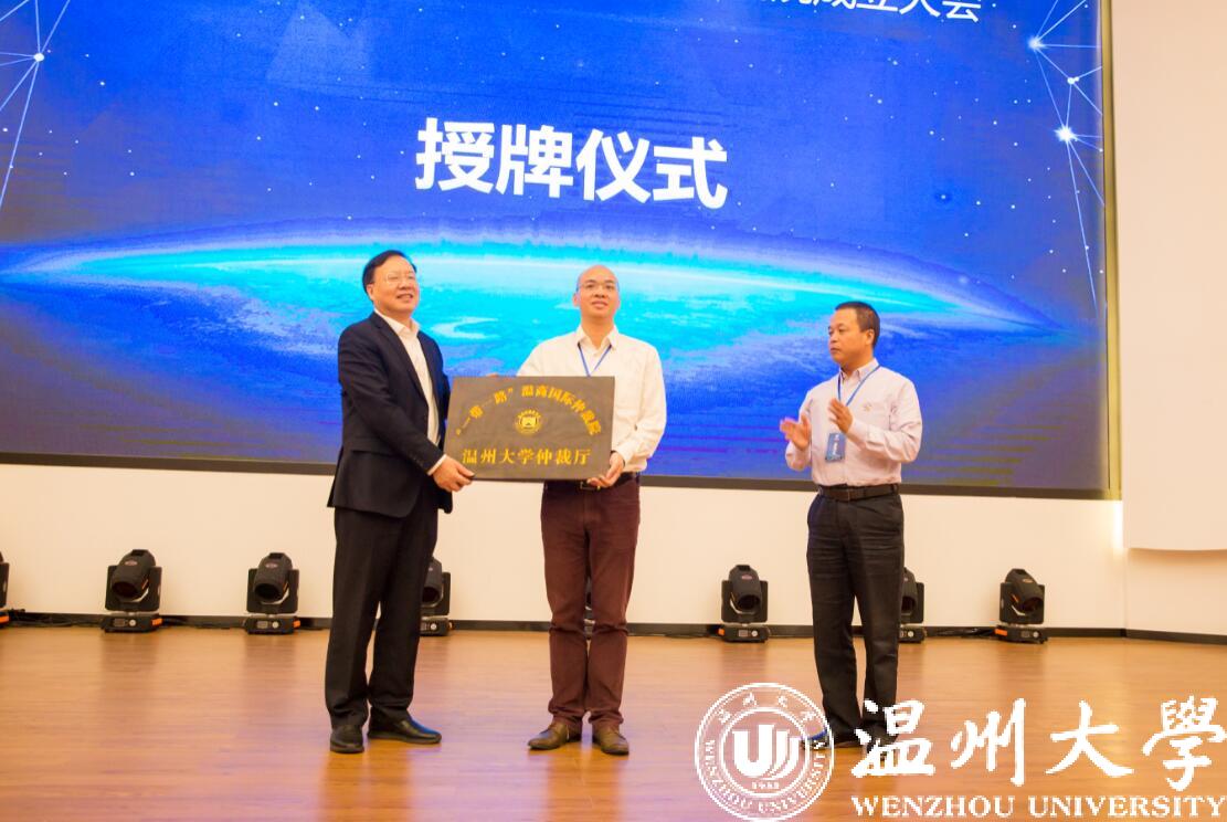 温州市司法局党委书记、局长卢斌主持成立大会。会上,卢斌局长宣读了温商国际仲裁院成立文件,温州市委常委、统战部部长施艾珠、副市长李无文与温州大学校长赵敏、副校长徐和昆等领导上台共同按下了仲裁院的成立按钮,宣告“一带一路”温商国际仲裁院的正式成立。随后,徐和昆副校长代表温州大学与温州市司法局、温州仲裁委签订了合作协议,副市长李无文为“一带一路”温商国际仲裁院温州大学仲裁厅进行了授牌仪式。