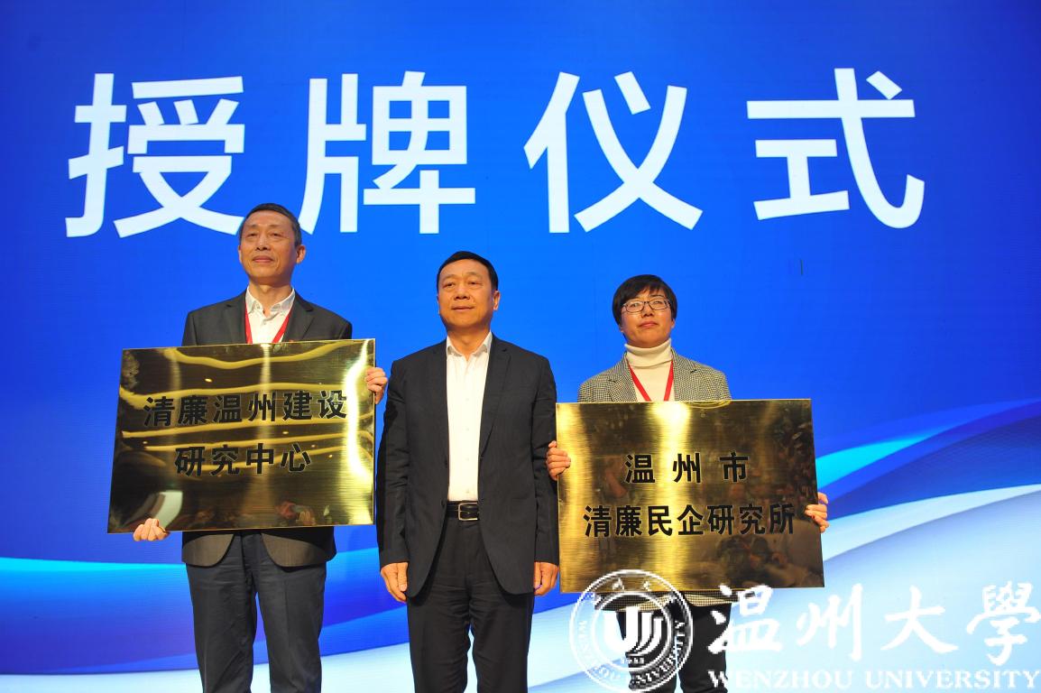 论坛现场清廉温州建设研究中心、清廉民企研究所正式授牌落户温州大学。清廉温州建设研究中心和清廉民企研究所是由中共温州市纪委、温州市监察委员会与温州大学共同建立的研究机构。研究中心将探索“理论研究-决策咨询-廉洁教育”“三位一体”模式,致力于温州市反腐倡廉理论研究、决策咨询以及廉洁教育和人才培养;清廉民企研究所则将以新时代“两个健康”先行区创建目标,为推进清廉民企建设、助力企业打造清廉文化、构建亲清政商关系开展理论研究、实践调研。通过与相关民企、行业协会、商会等常态化的联盟合作,搭建起纪检监察机关与民企沟通的桥梁,使清廉思想、清廉制度、清廉规则、清廉纪律、清廉文化融入民营企业发展之中,助力将温州建设成民企清廉建设的高水平示范区。