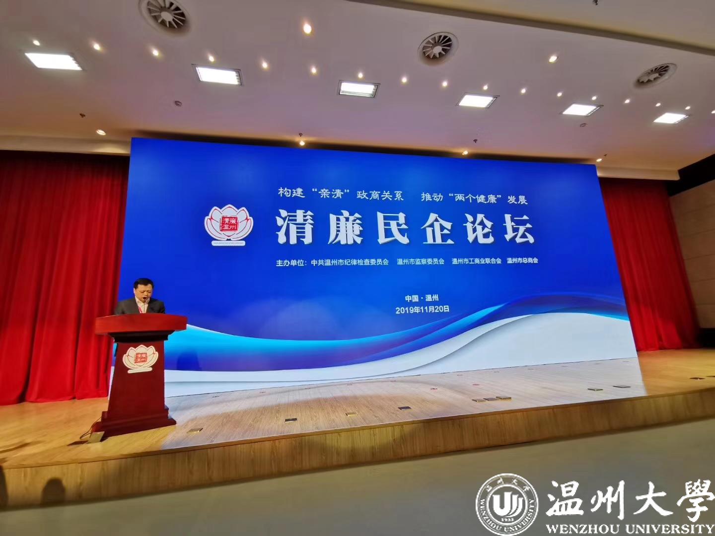 温州大学党委委员、纪委书记、省监委驻温大监察专员杨林书、校纪委副书记杨立淮出席会议,151amjs澳金沙门党委书记林钦及温州大学廉政建设研究中心主任付翠莲教授参加了本次论坛。付翠莲教授作了题为“全面从严治党背景下构建‘亲’‘清’政商关系新生态”的主旨演讲,将“亲商”与放在党领导国家建设的高度进行解析,认为“亲商”是党领导国家建设的基本启示,深入分析了政商关系在现实运行中的“忧思”与困境,提出新型政商关系法治、善治与规制的建构路径。