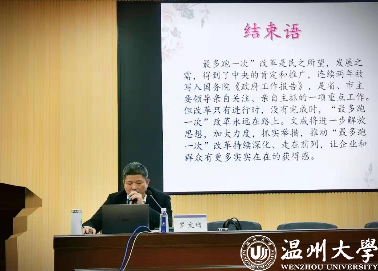 在讲座主题内容正式开始之前,罗主任带领师生们领略了文成的风土人情,然后正式开始主题内容的分享。罗主任首先介绍了文成县政务服务的职责、编制、相关的工作流程和机构改革后的变化和原因,之后分别从五个方面介绍了“最多跑一次”改革。一是“最多跑一次”改革的内涵。“最多跑一次”是群众和企业找政府依申请办事,在申报材料齐全符合法定要求的前提下“最多跑一次”办成。二是介绍了文成在“最多跑一次”改革中的创新做法。如农村个人建房审批“一窗受理、集成服务”改革。文成县自2017年5月开始实施农村个人建房“一窗受理、集成服务”改革以来,规范审批流程,优化代办服务,强化中介监管,促进审批便民化,推动服务精细化,实现监管实时化,极大提升了办事效率,增强了群众幸福感和获得感。三是介绍了涉侨综合服务改革。多年来,中心一直秉承标准化管理。合理划分功能区域,制定公布标准化办事指南,全面建立各项配套制度,加强窗口人员建设。四是指出了当前“最多跑一次”改革存在的问题。主要是改革推进工作的机制不顺畅、窗口人员素质和业务要求不够匹配、涉批中介不够规范、事项管理不够统一、数据信息不够共享、监管技术不够到位、改革目标设定上不够科学等。五是提出了文成下一步改革的思考。如提出加快侨务综合改革先行区建设,全面推进省定“一件事”落地运行,继续落实民生事项“就近能办”工作,持续完善办事大厅标准化建设等对策建议。