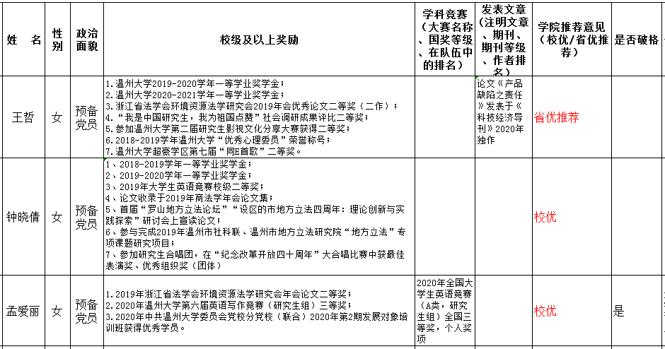 根据《温州大学研究生优秀毕业生评选办法》(行政〔2019〕225号)(附件1)文件精神,学院组织开展了2021届研究生省、校级优秀毕业生的预评工作。我院名额:省优1人、校优1人。通知发出后,有5名学生报名参评。其中孟爱丽同学获得全国大学生英语竞赛三等奖,破格推荐评为校级优秀毕业生,不占用学院名额。学院审核申报者的材料,由学生工作委员会根据学生的学习成绩、获奖、科研成果、平时综合表现等情况投票,决定推荐王哲参加省优毕业生评选、推荐钟晓倩评为校优毕业生。具体由学校研究生工作部复审后公示最终的评选结果。现将学生的基本信息公示如下: