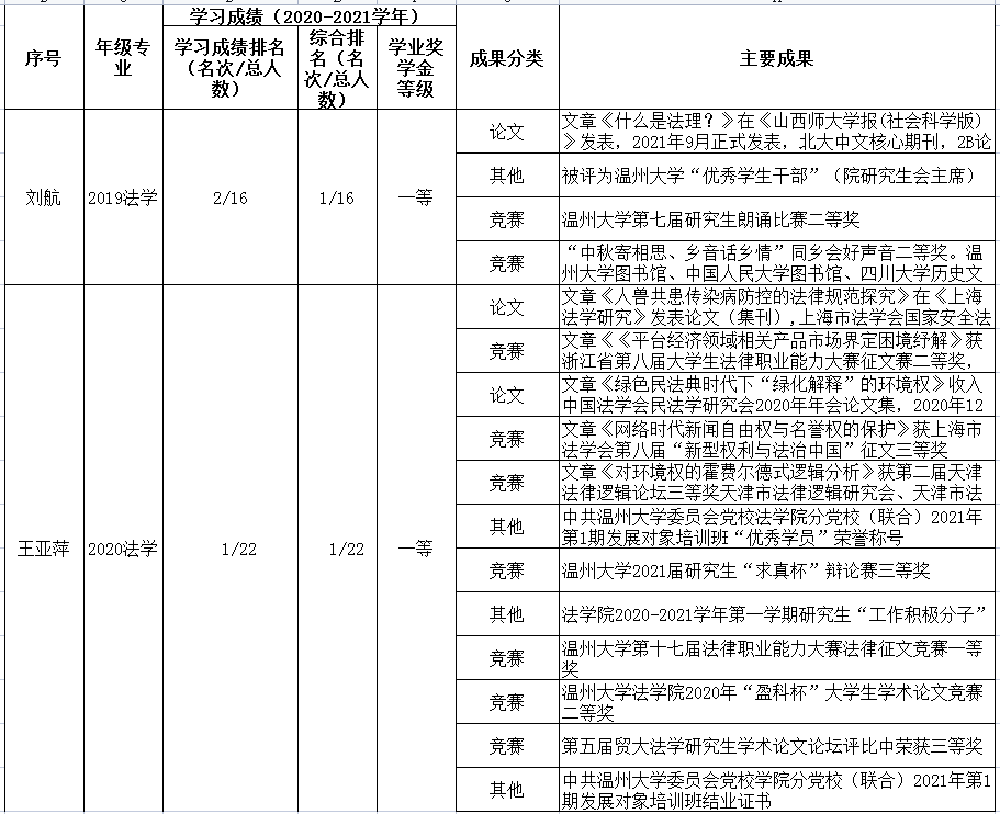 为激发广大研究生勤奋学习、潜心科研、勇于创新、追求卓越,充分发挥研究生国家奖学金的激励导向作用,根据省教育厅、财政厅有关文件及《温州大学研究生国家奖学金管理办法》(行政〔2013〕159号)等文件精神,学院开展2021年度研究生国家奖学金评选。经学院通知、学生报名、资格审核、学院评审等环节,现对学院评审结果进行公示。